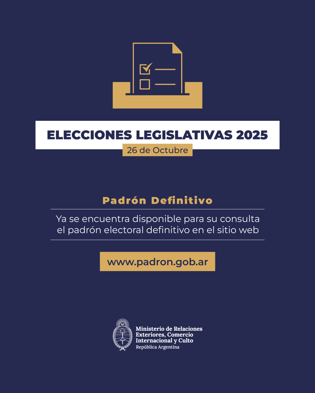 El 26 de octubre se celebrarán las Elecciones Legislativas 2025 y ya se puede consultar el Padrón Electoral Definitivo en www.padron.gob.ar. Ingrese su DNI y seleccione "Argentinos en el exterior...